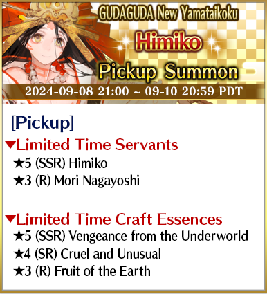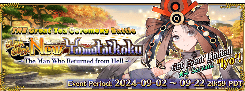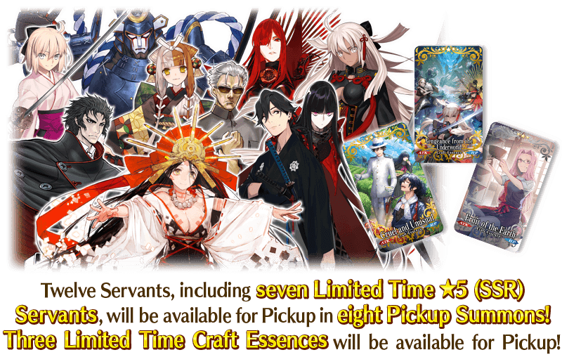 To commemorate the Limited Time Event "THE Great Tea Ceremony Battle: GUDAGUDA New Yamataikoku, The Man Who Returned from Hell", 12 Servants, including 11 Limited Time Servants, will be available for Pickup in eight Pickup Summons!