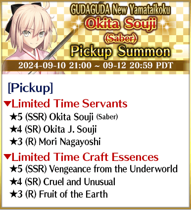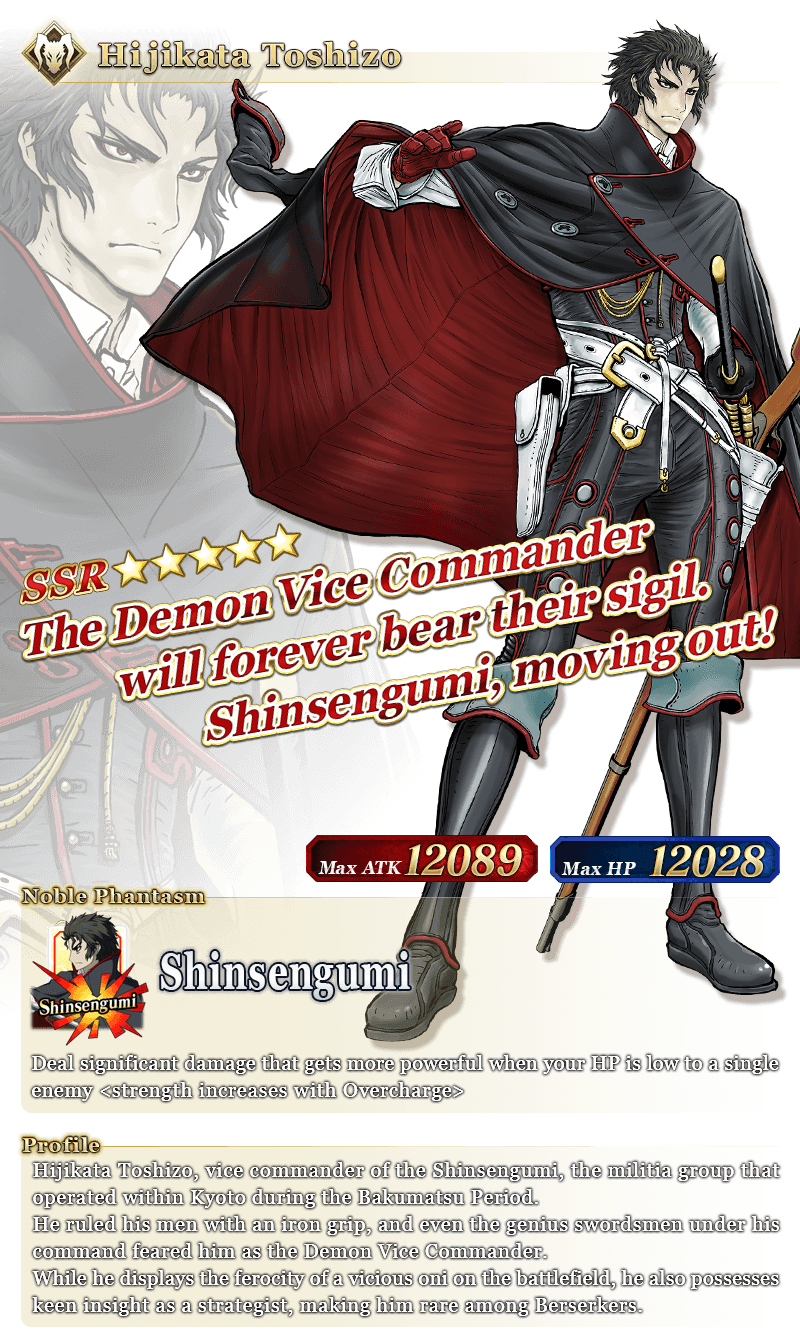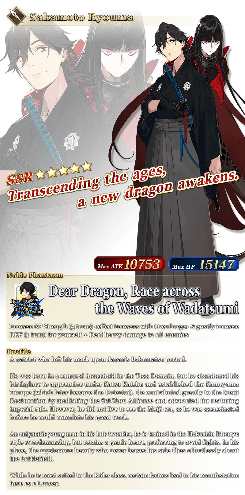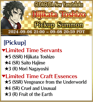 About Featured Servants: * The name displayed for ★5 (SSR) Demon King Nobunaga (Oda Nobunaga) will change from ★5 (SSR) Oda Nobunaga to ★5 (SSR) Demon King Nobunaga with Stage 3 Ascension. * The following Servant(s) will only be summonable from the Summon Lineup(s) where they are featured as Pickup Servant(s). Please be sure to confirm the lineup before summoning. - ★5 (SSR) Okita Souji (Saber) - ★5 (SSR) Sakamoto Ryouma (Lancer) - ★5 (SSR) Izumo-no-Okuni - ★5 (SSR) Li Shuwen (Assassin) - ★5 (SSR) Hijikata Toshizo - ★5 (SSR) Himiko - ★5 (SSR) Demon King Nobunaga (Oda Nobunaga) - ★5 (SSR) Okita Souji (Alter) (Alter Ego) - ★4 (SR) Saito Hajime - ★4 (SR) Okita J. Souji - ★4 (SR) Oda Nobunaga (Berserker) * The following Servant(s) will not be added to Story Summon after the Pickup Summon period ends. - ★5 (SSR) Okita Souji (Saber) - ★5 (SSR) Sakamoto Ryouma (Lancer) - ★5 (SSR) Izumo-no-Okuni - ★5 (SSR) Hijikata Toshizo - ★5 (SSR) Himiko - ★5 (SSR) Demon King Nobunaga (Oda Nobunaga) - ★5 (SSR) Okita Souji (Alter) (Alter Ego) - ★4 (SR) Saito Hajime - ★4 (SR) Okita J. Souji - ★4 (SR) Oda Nobunaga (Berserker) - ★3 (R) Mori Nagayoshi * The following Servant(s) will be summonable from the Summon Lineup(s) where they are featured as Pickup Servant(s), even if they have not yet been added to Story Summon through story progression. No other Servants added to Story Summon through story progression will be summonable. - ★5 (SSR) Li Shuwen (Assassin) * Please note that the following Servant(s) will not be available through Friend Point Summon. - ★3 (R) Mori Nagayoshi * The following Servant(s) will continue to be available through Story Summon after the Pickup Summon period ends. - ★5 (SSR) Li Shuwen (Assassin)