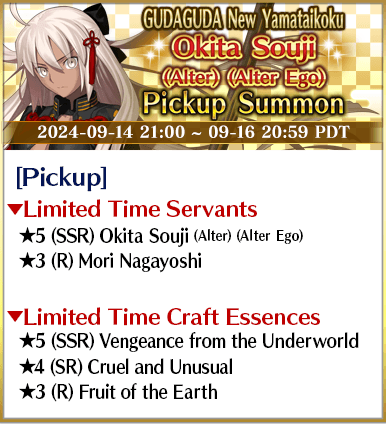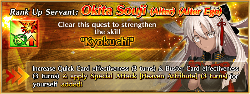 Servant Rank Up Quests to strengthen ★5 (SSR) Okita Souji (Alter) (Alter Ego) and ★3 (R) Mori Nagayoshi will be permanently added to Chaldea Gate.