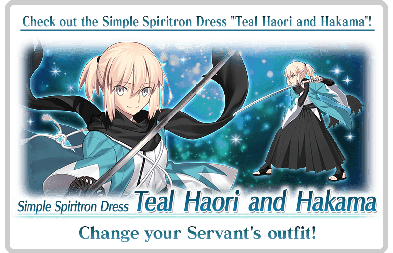 The Wardrobe Key for the Simple Spiritron Dress "Teal Haori and Hakama" for ★5 (SSR) Okita Souji (Saber) will become free to exchange in "Dress Making" in the Da Vinci Workshop once you have cleared Final Singularity!