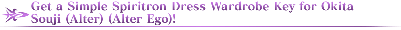 About the Spiritron Dress Wardrobe Key: * The Spiritron Dress Wardrobe Key for ★5 (SSR) Okita Souji (Alter) (Alter Ego) can be acquired only during the event period of the Limited Time Event "THE Great Tea Ceremony Battle: GUDAGUDA New Yamataikoku, The Man Who Returned from Hell". * The Simple Spiritron Dress for ★5 (SSR) Okita Souji (Alter) (Alter Ego) will change her Servant name, appearance, and voice lines. * Please note that although it is possible to obtain the Spiritron Dress Wardrobe Key even if you do not have ★5 (SSR) Okita Souji (Alter) (Alter Ego), you cannot unlock the Spiritron Dress.