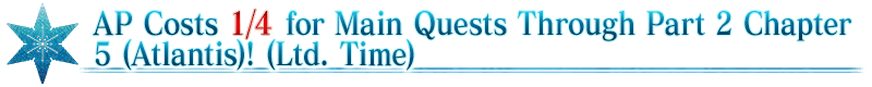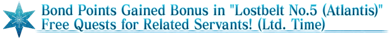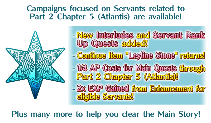 During the campaign period, Rank Up Quests and Interludes for Servants related to Part 2 Chapter 5 "Lostbelt No.5: Ancient Ocean of the Dreadnought Gods, Atlantis - The Day to Bring Down Gods" will have their AP costs halved! (AP costs do not change even if you withdraw from battle)