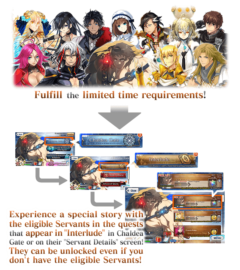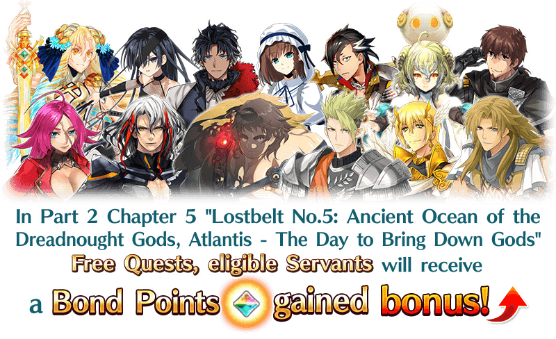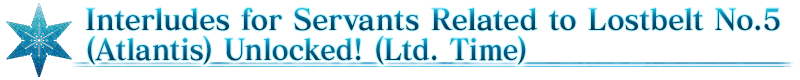 For a limited time, the Interludes of Servants related to Part 2 Chapter 5 "Lostbelt No.5: Ancient Ocean of the Dreadnought Gods, Atlantis - The Day to Bring Down Gods" will be unlockable even if you do not own a copy of that Servant!