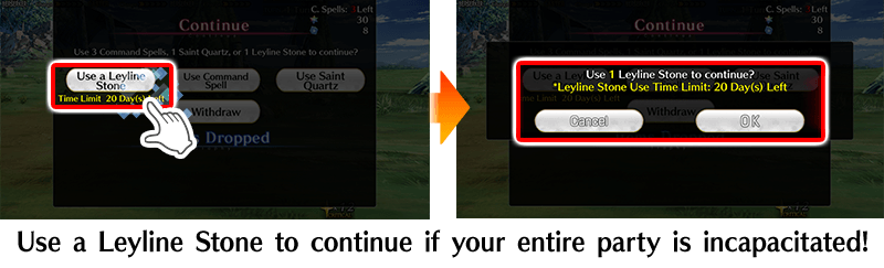 Leyline Stones will return as a limited time item for "Road to 7: Lostbelt No.5 (Atlantis)". If you are defeated in battle within the Main Quest (Part 1 prologue through Part 2 Chapter 6.5), you can expend this item to revive your party and return to the fight!