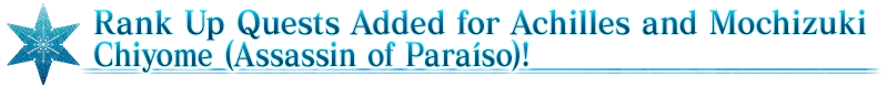 Servant Rank Up Quests to strengthen ★5 (SSR) Achilles and ★4 (SR) Mochizuki Chiyome (Assassin of Paraíso) will be permanently added to Chaldea Gate.