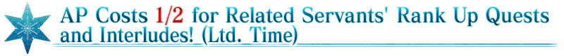 * All Interludes of the above Servants are included in this campaign (including in the case of Servants who have multiple Interludes). * In the event that you meet the requirements and clear an Interlude of a Servant who you do not yet own during the campaign period, any strengthening rewards provided as clear rewards will be applied to that Servant should you obtain them in the future. * The completion of Servant Interludes will still count towards your Extra Mission progress even if you do not own the related Servant. * All Interludes that are part of this campaign, if not cleared during the campaign period, will no longer be available to Masters who do not own the Servant in question and will return to their normal unlock conditions after the campaign period ends. * Servant Interludes you have already cleared cannot be played again.
