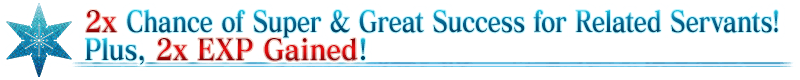 During the campaign period, when Enhancing Servants related to Part 2 Chapter 5 "Lostbelt No.5: Ancient Ocean of the Dreadnought Gods, Atlantis - The Day to Bring Down Gods", the chance of Super Success (double EXP) and Great Success (triple EXP) will be doubled! Plus, the eligible Servants will gain double EXP!