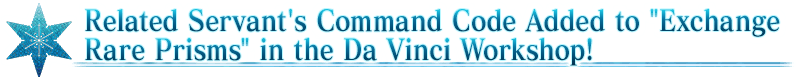 To commemorate the campaign "Road to 7: Lostbelt No.5 (Atlantis)", a Command Code for a Servant related to Lostbelt No.5 (Atlantis) will be permanently added to "Exchange Rare Prisms" in the Da Vinci Workshop!
