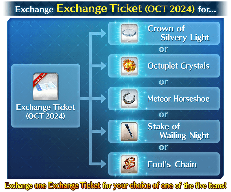 The "Exchange Ticket (OCT 2024)" available as a daily login bonus and daily mission rewards will be exchangeable for the following items.