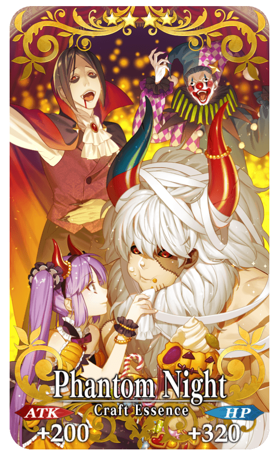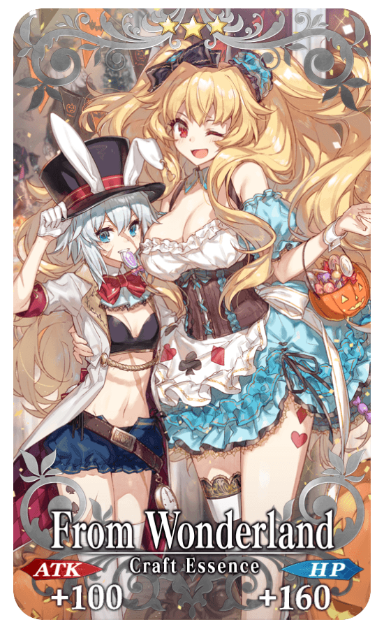 About Featured Craft Essences: * The Limited Time Craft Essences available from this Pickup Summon will not grant an event bonus within the Limited Time Event "Halloween Rebellion of 108! A Dragon Girl's Water Margin". * The following Craft Essence(s) will also be available from Friend Point Summon for the duration of the Pickup Summon period. - ★3 (R) From Wonderland - ★3 (R) Jack-o'-lantern * The following Craft Essence(s) will be automatically burned if you have ★3 (R) Craft Essences included in your Automatic Burning settings. Please check your settings before summoning. - ★3 (R) From Wonderland - ★3 (R) Jack-o'-lantern