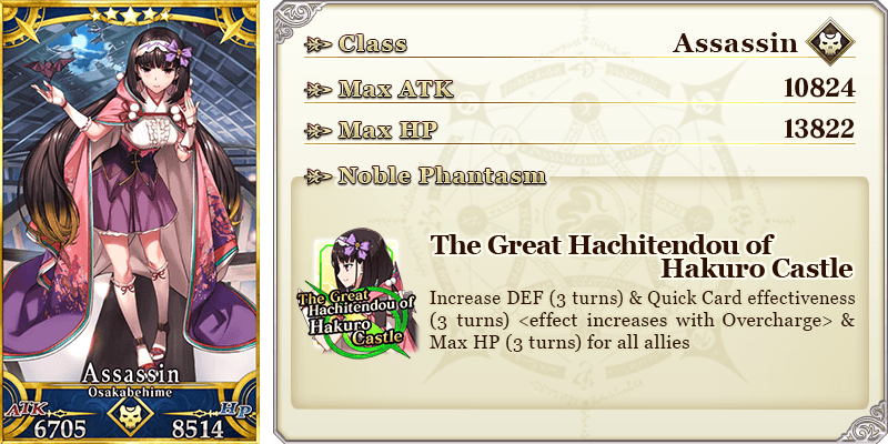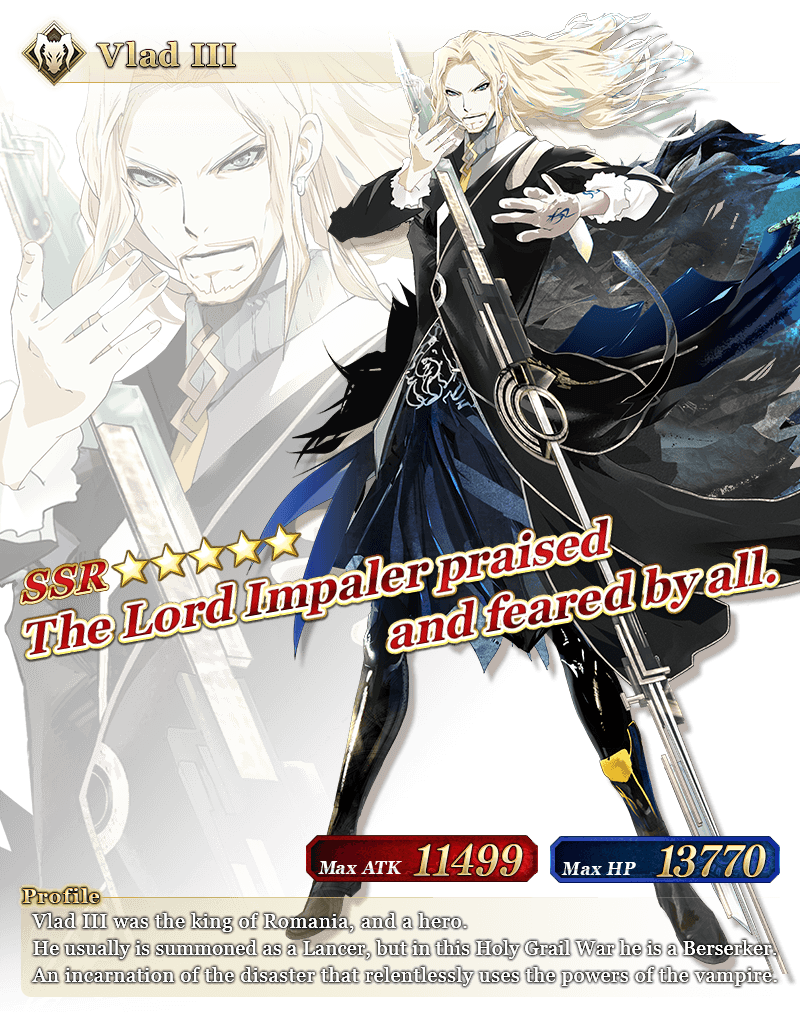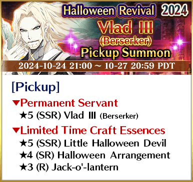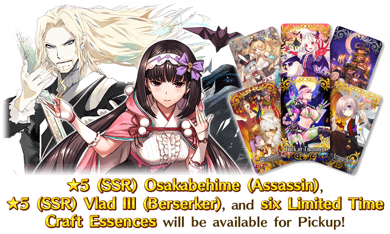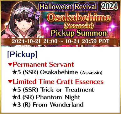 About Featured Servants: * The following Servant(s) will be added to Story Summon at 2024-10-31 21:00 PDT (GMT -7), but they will not be summonable from this Pickup Summon. - ★4 (SR) Huang Feihu * The following Servant(s) will continue to be available through Story Summon after the Pickup Summon period ends. - ★5 (SSR) Osakabehime (Assassin) - ★5 (SSR) Vlad III (Berserker) * Servants added to Story Summon through story progression will not be summonable. Please be sure to confirm the lineup before summoning.