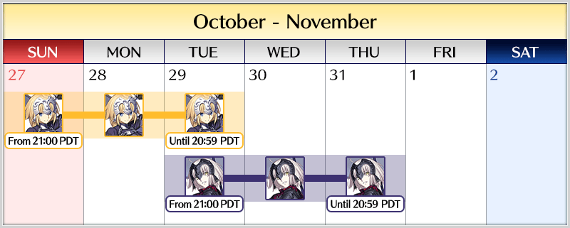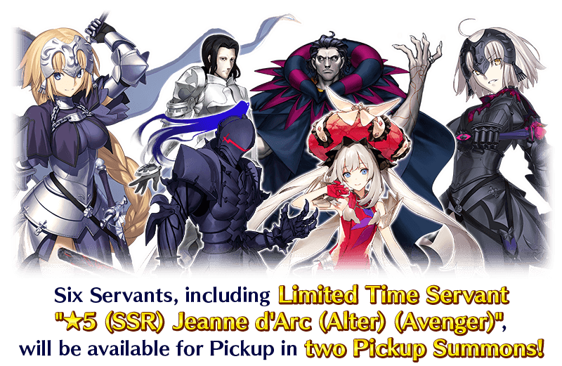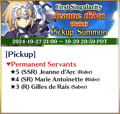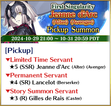 About Featured Servants: * The following Servant(s) will only be summonable from the Summon Lineup(s) where they are featured as Pickup Servant(s). Please be sure to confirm the lineup before summoning. - ★5 (SSR) Jeanne d'Arc (Alter) (Avenger) - ★3 (R) Gilles de Rais (Caster) * The following Servant(s) will not be added to Story Summon after the Pickup Summon period ends. - ★5 (SSR) Jeanne d'Arc (Alter) (Avenger) * The following Servant(s) will be added to Story Summon at 2024-10-31 21:00 PDT (GMT -7), but they will not be summonable from this Pickup Summon. - ★4 (SR) Huang Feihu * The following Servant(s) will be summonable from the Summon Lineup(s) where they are featured as Pickup Servant(s), even if they have not yet been added to Story Summon through story progression. No other Servants added to Story Summon through story progression will be summonable. - ★3 (R) Gilles de Rais (Caster) * The following Servant(s) will continue to be available through Story Summon after the Pickup Summon period ends. - ★5 (SSR) Jeanne d'Arc (Ruler) - ★4 (SR) Marie Antoinette (Rider) - ★4 (SR) Lancelot (Berserker) - ★3 (R) Gilles de Rais (Saber) - ★3 (R) Gilles de Rais (Caster)