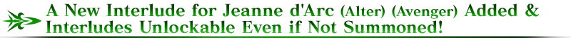 The unlock requirements of her Interludes will be changed to special unlock requirements for a limited time. Take this opportunity to clear ★5 (SSR) Jeanne d'Arc (Alter) (Avenger)'s Interludes!