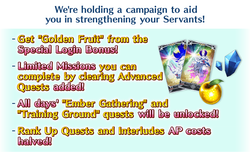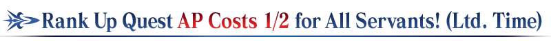 During the campaign period, Rank Up Quests for all Servants will have their AP costs halved! (AP costs do not change even if you withdraw from battle)