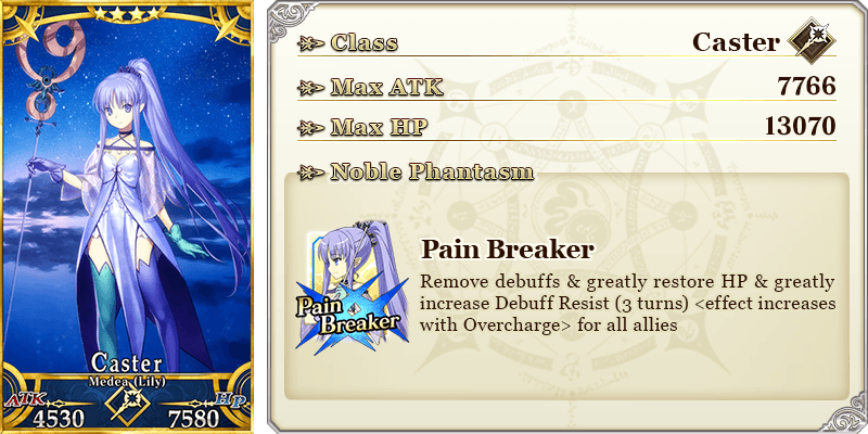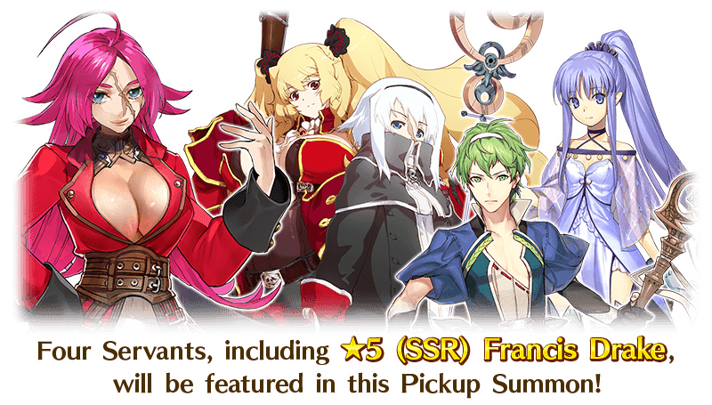 About Featured Servants: * The following Servant(s) will be summonable, even if they have not yet been added to Story Summon through story progression. No other Servants added to Story Summon through story progression will be summonable. - ★4 (SR) Medea (Lily) * The following Servant(s) will continue to be available through Story Summon after the Pickup Summon period ends. - ★5 (SSR) Francis Drake - ★4 (SR) Anne Bonny & Mary Read (Rider) - ★4 (SR) Medea (Lily) - ★3 (R) David