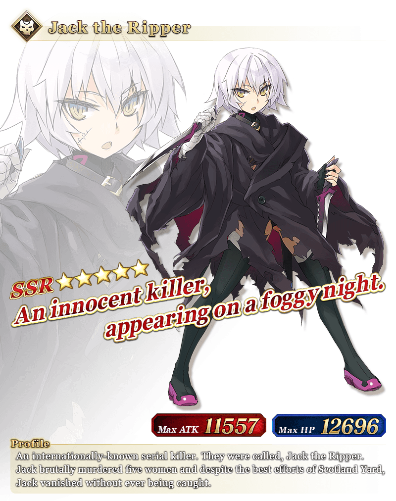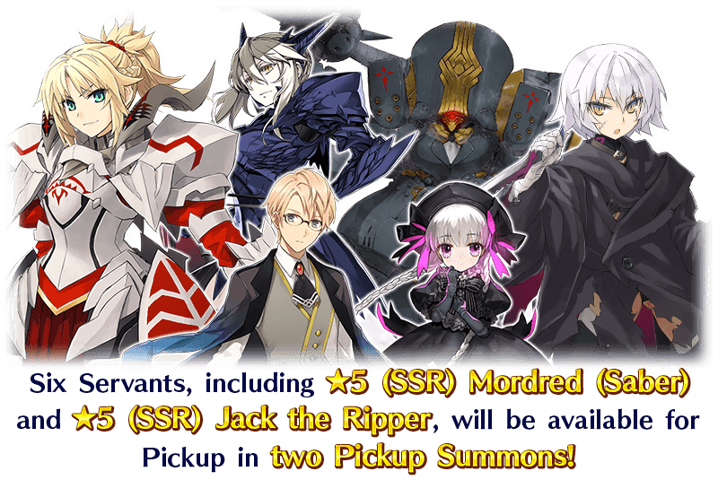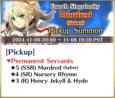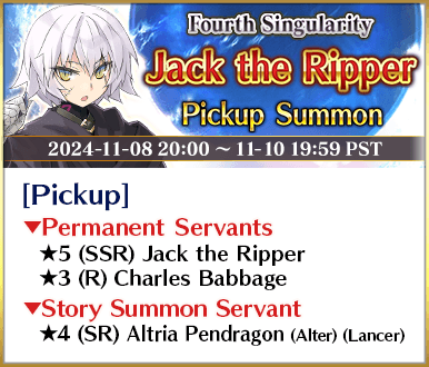 About Featured Servants: * The following Servant(s) will only be summonable from the Summon Lineup(s) where they are featured as Pickup Servant(s). Please be sure to confirm the lineup before summoning. - ★4 (SR) Altria Pendragon (Alter) (Lancer) * The following Servant(s) will be summonable from the Summon Lineup(s) where they are featured as Pickup Servant(s), even if they have not yet been added to Story Summon through story progression. No other Servants added to Story Summon through story progression will be summonable. - ★4 (SR) Altria Pendragon (Alter) (Lancer) * The following Servant(s) will continue to be available through Story Summon after the Pickup Summon period ends. - ★5 (SSR) Mordred (Saber) - ★5 (SSR) Jack the Ripper - ★4 (SR) Altria Pendragon (Alter) (Lancer) - ★4 (SR) Nursery Rhyme - ★3 (R) Charles Babbage - ★3 (R) Henry Jekyll & Hyde