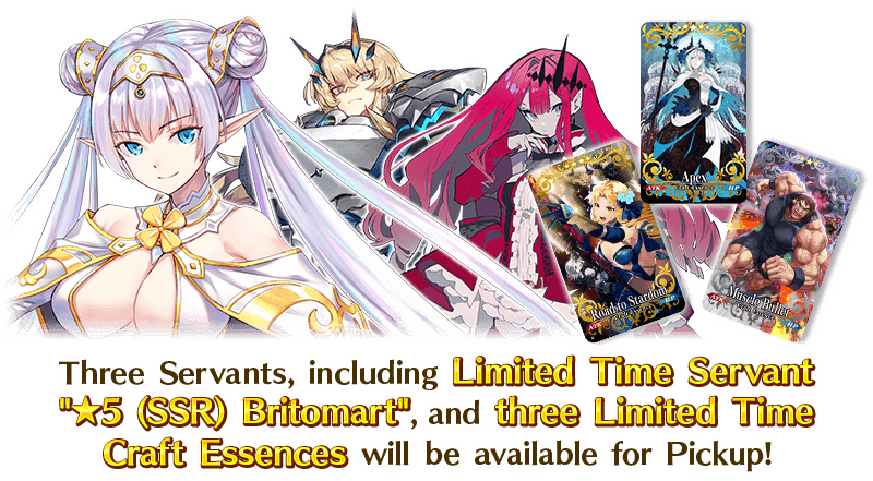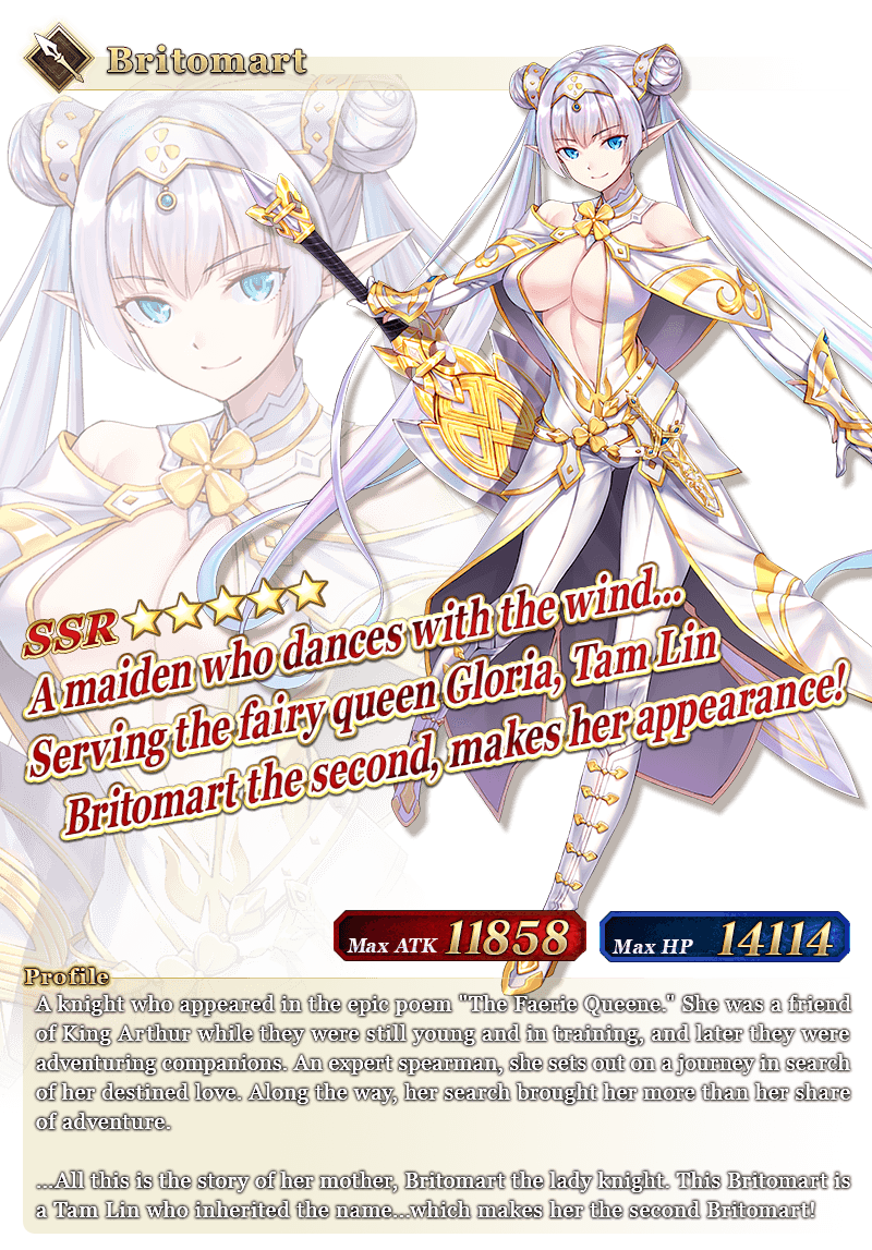 About Featured Servants: * The following Servant(s) will not be added to Story Summon after the Pickup Summon period ends. - ★5 (SSR) Britomart * The following Servant(s) will be summonable, even if they have not yet been added to Story Summon through story progression. No other Servants added to Story Summon through story progression will be summonable. - ★4 (SR) Barghest (Tam Lin Gawain) - ★4 (SR) Baobhan Sith (Tam Lin Tristan) * The following Servant(s) will continue to be available through Story Summon after the Pickup Summon period ends. - ★4 (SR) Barghest (Tam Lin Gawain) - ★4 (SR) Baobhan Sith (Tam Lin Tristan) * Please note that the Stage 3 Ascensions of ★4 (SR) Barghest (Tam Lin Gawain) and ★4 (SR) Baobhan Sith (Tam Lin Tristan) contain spoilers for "Lostbelt No.6: Fae Round Table Domain, Avalon le Fae - The Moment a Planet Is Born".