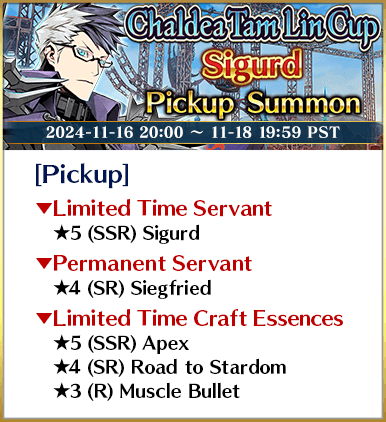 About Featured Servants: * The following Servant(s) will only be summonable from the Summon Lineup(s) where they are featured as Pickup Servant(s). Please be sure to confirm the lineup before summoning. - ★5 (SSR) Sigurd - ★5 (SSR) Brynhild (Lancer) - ★5 (SSR) Sakata Kintoki (Berserker) - ★4 (SR) Kriemhild * The following Servant(s) will not be added to Story Summon after the Pickup Summon period ends. - ★5 (SSR) Sigurd - ★5 (SSR) Brynhild (Lancer) - ★5 (SSR) Sakata Kintoki (Berserker) * The following Servant(s) will be summonable from the Summon Lineup(s) where they are featured as Pickup Servant(s), even if they have not yet been added to Story Summon through story progression. No other Servants added to Story Summon through story progression will be summonable. - ★4 (SR) Kriemhild * The following Servant(s) will continue to be available through Story Summon after the Pickup Summon period ends. - ★4 (SR) Siegfried - ★4 (SR) Heracles - ★4 (SR) Kriemhild