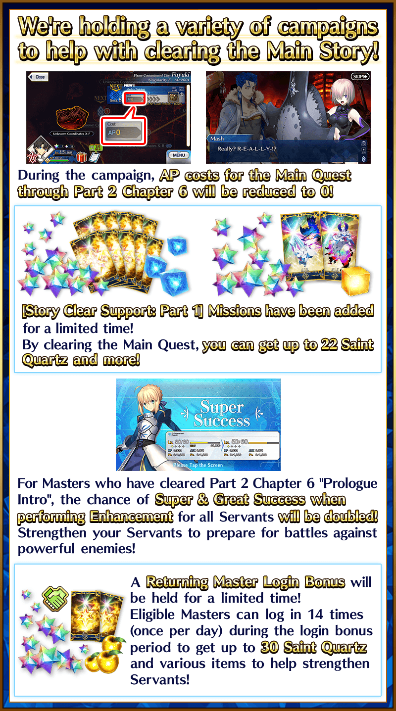 * As AP costs for the Main Quest through Part 2 Chapter 6 have been permanently halved, they will return to 1/2 cost following the end of this campaign.