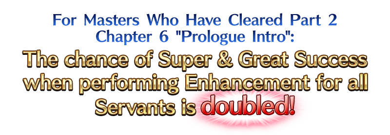 As part of the "Singularity Repair Support Campaign 2024: Part 6", ongoing from 2024-10-27 21:00 PDT (GMT -7) to 11-30 19:59 PST (GMT -8), the Servants who are summoned when you repair a Singularity in Part 1 of the Main Story will be eligible for a double chance of Super Success and Great Success bonus when performing Enhancement. In the case of Servants eligible for the same bonus in both the "Singularity Repair Support Campaign 2024: Part 6" and the "'Lostbelt No.7' Pre-Release Story Clear Support Campaign: Part 1", the chance of Super Success and Great Success will remain doubled. The bonus will not stack.