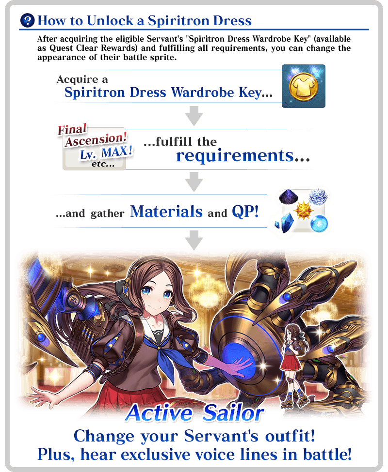 * Upon unlocking a Spiritron Dress, the Servant's battle sprite and icons will automatically be changed. You can revert back to the original appearance or change to a different Ascension stage from the Servant Details screen.