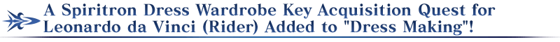 * Please note that although it is possible to obtain the Spiritron Dress Wardrobe Key even if you do not have ★5 (SSR) Leonardo da Vinci (Rider), you cannot unlock the Spiritron Dress.