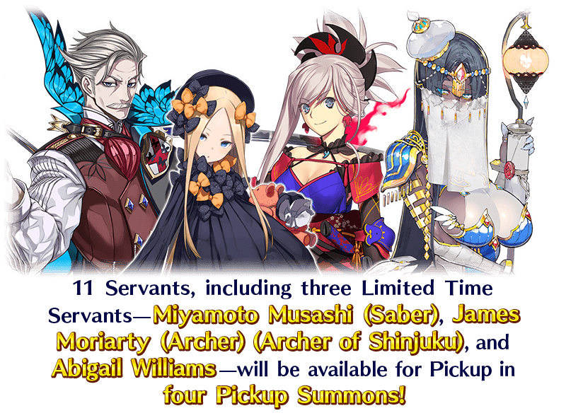 About Featured Servants: * The following Servant(s) will only be summonable from the Summon Lineup(s) where they are featured as Pickup Servant(s). Please be sure to confirm the lineup before summoning. - ★5 (SSR) Miyamoto Musashi (Saber) - ★5 (SSR) James Moriarty (Archer) (Archer of Shinjuku) - ★5 (SSR) Abigail Williams - ★4 (SR) Yagyu Tajima-no-kami Munenori - ★4 (SR) Emiya (Alter) - ★4 (SR) Queen of Sheba (Caster of Midrash) - ★4 (SR) Katou "Black Kite" Danzo * The following Servant(s) will not be added to Story Summon after the Pickup Summon period ends. - ★5 (SSR) Miyamoto Musashi (Saber) - ★5 (SSR) James Moriarty (Archer) (Archer of Shinjuku) - ★5 (SSR) Abigail Williams * The following Servant(s) will be summonable from the Summon Lineup(s) where they are featured as Pickup Servant(s), even if they have not yet been added to Story Summon through story progression. No other Servants added to Story Summon through story progression will be summonable. - ★4 (SR) Yagyu Tajima-no-kami Munenori - ★4 (SR) Emiya (Alter) - ★4 (SR) Queen of Sheba (Caster of Midrash) - ★4 (SR) Katou "Black Kite" Danzo * The following Servant(s) will continue to be available through Story Summon after the Pickup Summon period ends. - ★5 (SSR) Scheherazade (Caster of the Nightless City) - ★4 (SR) Yagyu Tajima-no-kami Munenori - ★4 (SR) Emiya (Alter) - ★4 (SR) Circe (Caster of Okeanos) - ★4 (SR) Queen of Sheba (Caster of Midrash) - ★4 (SR) Katou "Black Kite" Danzo - ★4 (SR) Penthesilea (Berserker of El Dorado) - ★3 (R) Houzouin Inshun * The name displayed for Servants whose True Names are hidden will change based on story progression. In some cases, the name displayed for their Noble Phantasm will also change.