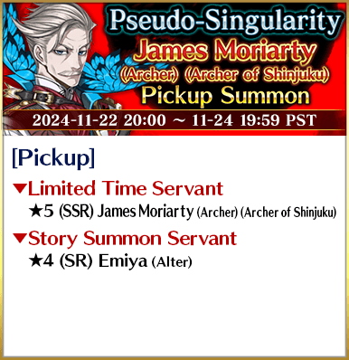 In addition, all Interludes for ★5 (SSR) James Moriarty (Archer) (Archer of Shinjuku) will be unlockable for a limited time even if you do not own a copy of him, until 2024-11-28 19:59 PST (GMT -8)!