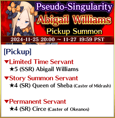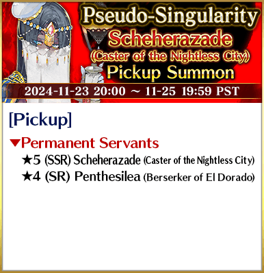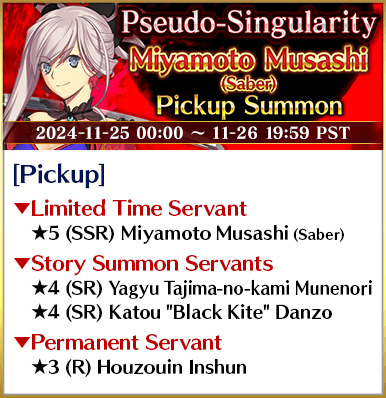 (Added on November 24th 17:00 PST) * Please note that maintenance is scheduled during the Pickup Summon Period for 2024-11-24 20:00 - 11-25 00:00 PST. It will not be possible to play the game or summon during maintenance. Please see this article for details on the scheduled maintenance: https://webview.fate-go.us/2024/1124_maintenance/