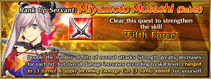 A Servant Rank Up Quest to strengthen ★5 (SSR) Miyamoto Musashi (Saber) will be permanently added to Chaldea Gate.
