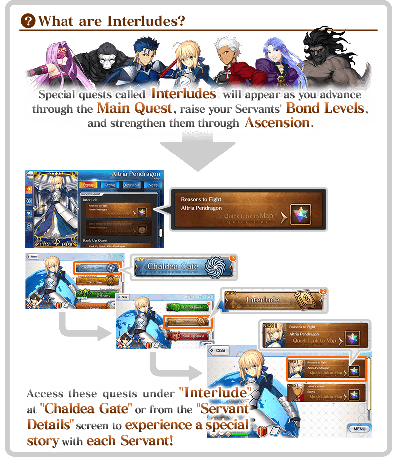 About Limited Time Interlude Unlock Requirements: * If an eligible Servant has multiple Interludes, the limited time unlock requirements will apply to all of them. * The completion of Servant Interludes will still count towards your Extra Mission progress even if you do not own the related Servant. * All Interludes that are part of this campaign, if not cleared during the campaign period, will no longer be available to Masters who do not own the Servant in question and will return to their normal unlock conditions after the campaign period ends. * Rewards earned by clearing these quests will be the regular rewards. * Servant Interludes you have already cleared cannot be played again.