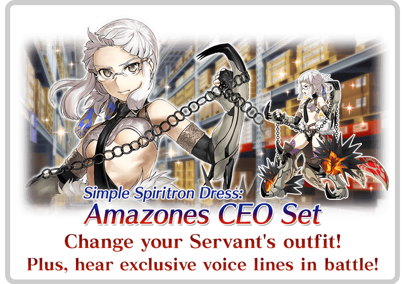 The Simple Spiritron Dress "Amazones CEO Set" Wardrobe Key for ★4 (SR) Penthesilea (Berserker of El Dorado) will become free to exchange in "Dress Making" in the Da Vinci Workshop once you have cleared Pseudo-Singularity II.
