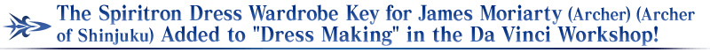About the Spiritron Dress Wardrobe Key: * The Spiritron Dress will change the appearance and some voice lines for ★5 (SSR) James Moriarty (Archer) (Archer of Shinjuku). * It will be possible to unlock the Spiritron Dress even if you have yet to reveal the True Name of ★5 (SSR) James Moriarty (Archer) (Archer of Shinjuku). * Please note that although it is possible to obtain the Spiritron Dress Wardrobe Key even if you do not have ★5 (SSR) James Moriarty (Archer) (Archer of Shinjuku), you cannot unlock the Spiritron Dress.
