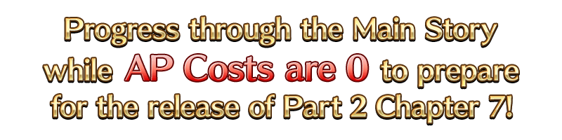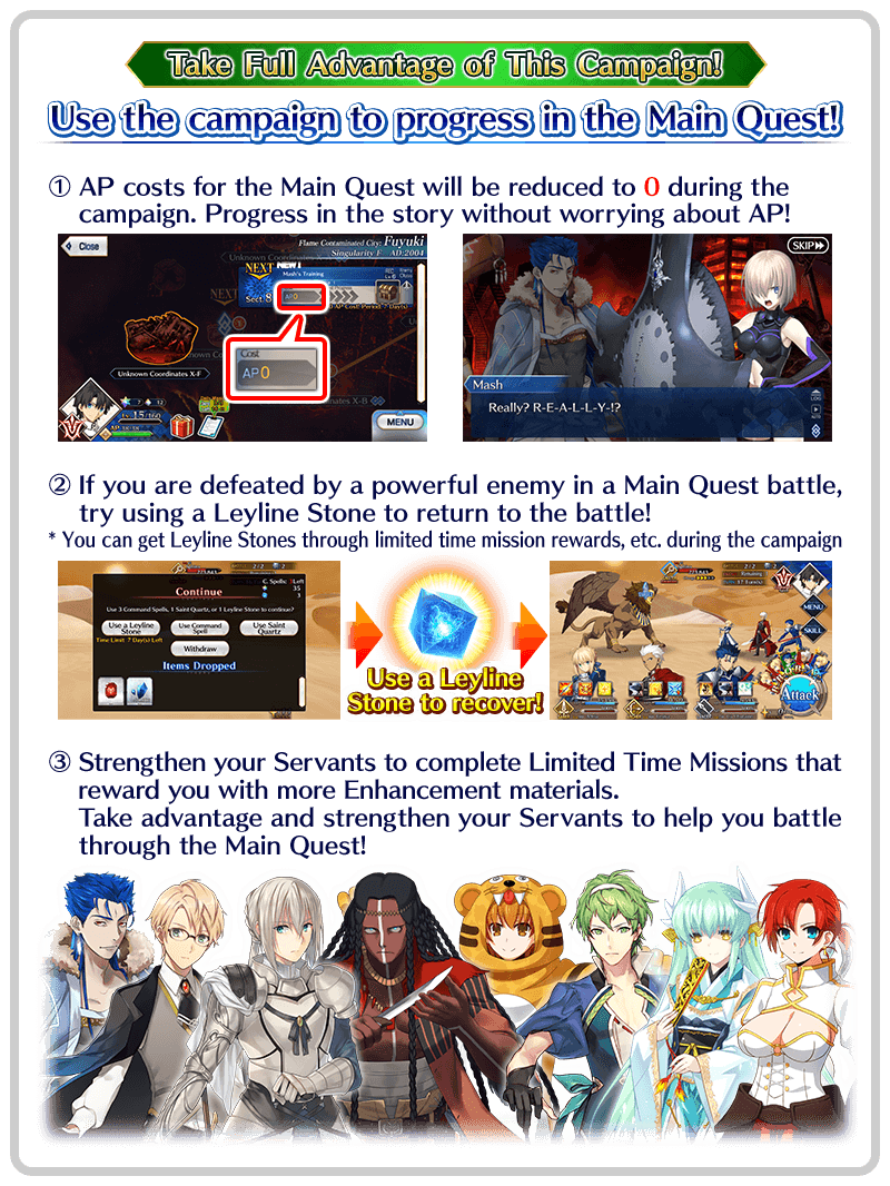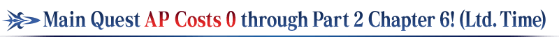 Eligible Quests: - Main Quests in Part 1 (Singularity F through Final Singularity) - Main Quests in Part 2 (Chapter 1 through Chapter 5, and Chapter 6) * Please note that Main Quest Part 2 Chapters 5.5 and 6.5, Pseudo-Singularities (I-IV), and Main Interludes will not be eligible. * As AP costs for Main Quests through Part 2 Chapter 6 have been permanently halved, they will return to 1/2 cost following the end of this campaign.