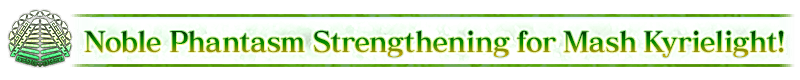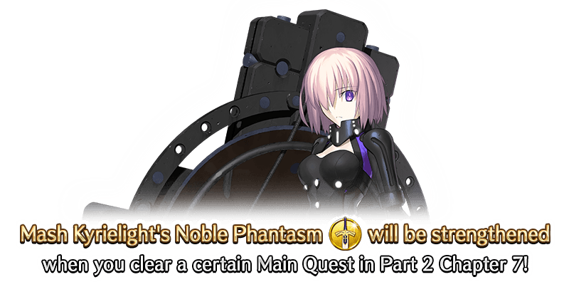 Mash Kyrielight's Noble Phantasm will be strengthened upon clearing a certain Main Quest in Part 2 Chapter 7 "Lostbelt No.7: Golden Sea of Trees, Nahui Mictlān - Those Who Rule the Planet" (Part 1)! * Along with her Noble Phantasm being strengthened, her voice lines in battle will also change.