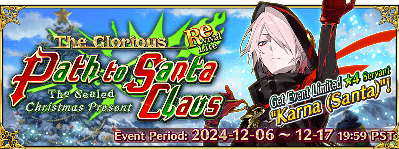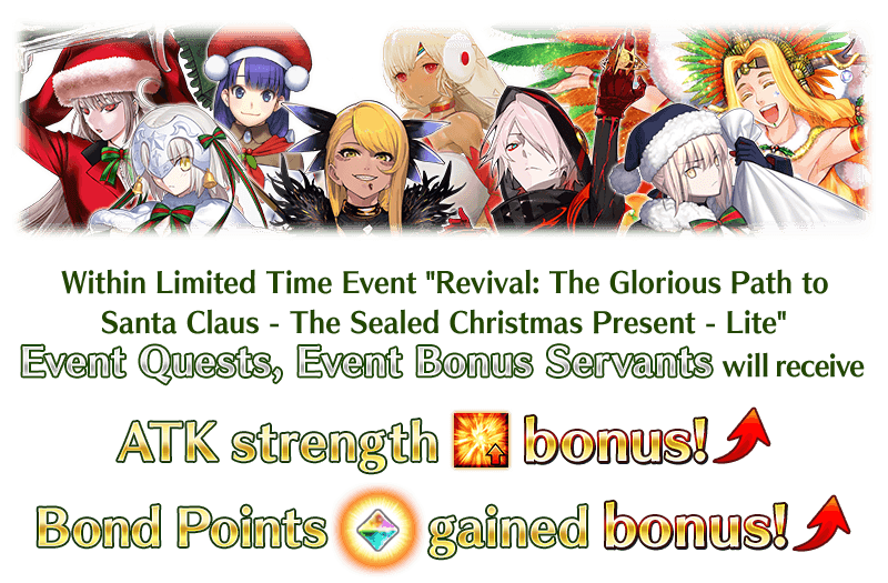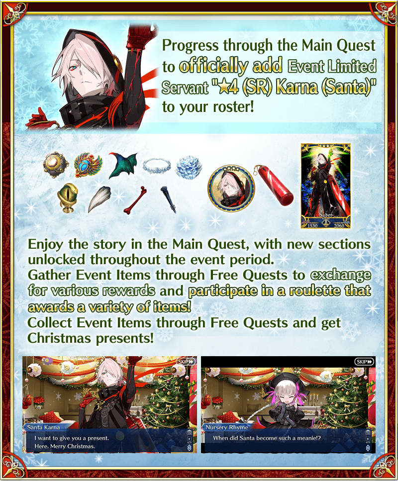 If you got ★4 (SR) Karna (Santa) in the original Limited Time Event "The Glorious Path to Santa Claus - The Sealed Christmas Present", bonus rewards will be available in this event.