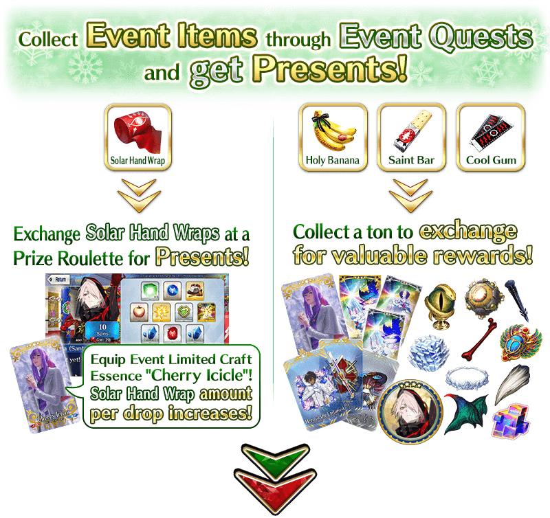 Equip the Limited Time Craft Essences "★5 (SSR) Twinkling Stars", "★4 (SR) Red Box", and "★3 (R) Freeze Frame", available for Pickup through the Saint Quartz Summon ongoing during this event, to receive a bonus to the amount per drop of event items Holy Banana, Saint Bar, and Cool Gum, respectively.