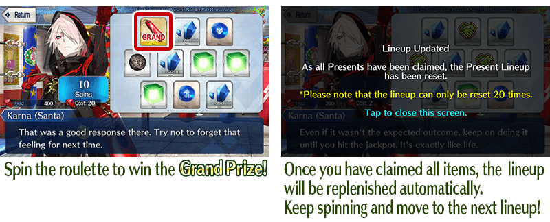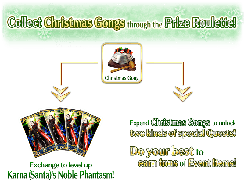 * Since this is a Revival - Lite event, there is a limit to how many times the Prize Lineup can be reset. Please note that the Prize Lineup can only be reset up to 19 times. Only 20 lineups will be available. * Starting with the 11th lineup, Grand Prizes, Golden Fruit, and Silver Fruit will be removed from the lineup. * Christmas Gong, an Event Item available in the Prize Roulette, can be used to exchange for Karna (Santa) [For Noble Phantasm Enhancement] and other materials, as well as to unlock special quests. * Solar Hand Wraps will disappear at the end of the exchange period.