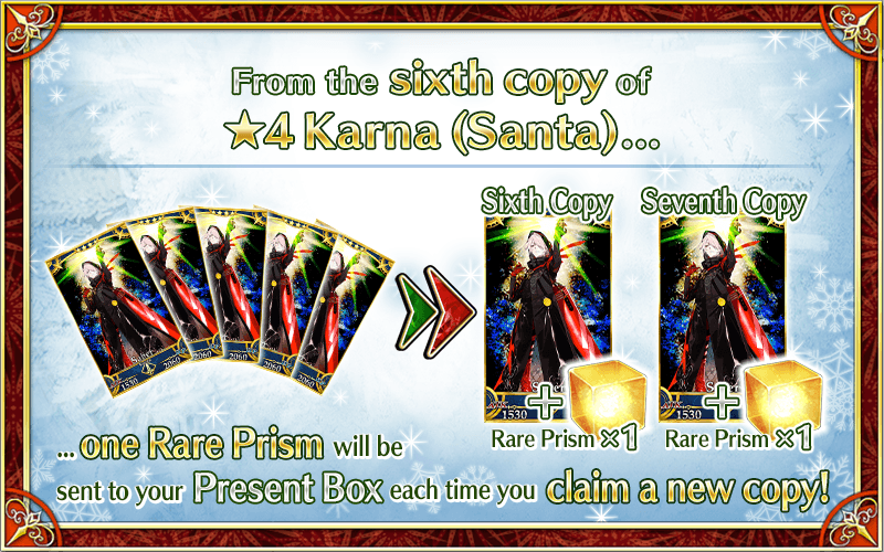 Once you have acquired a total of six copies of ★4 (SR) Karna (Santa), one Rare Prism will be sent to your Present Box for each new copy, beginning with the sixth.