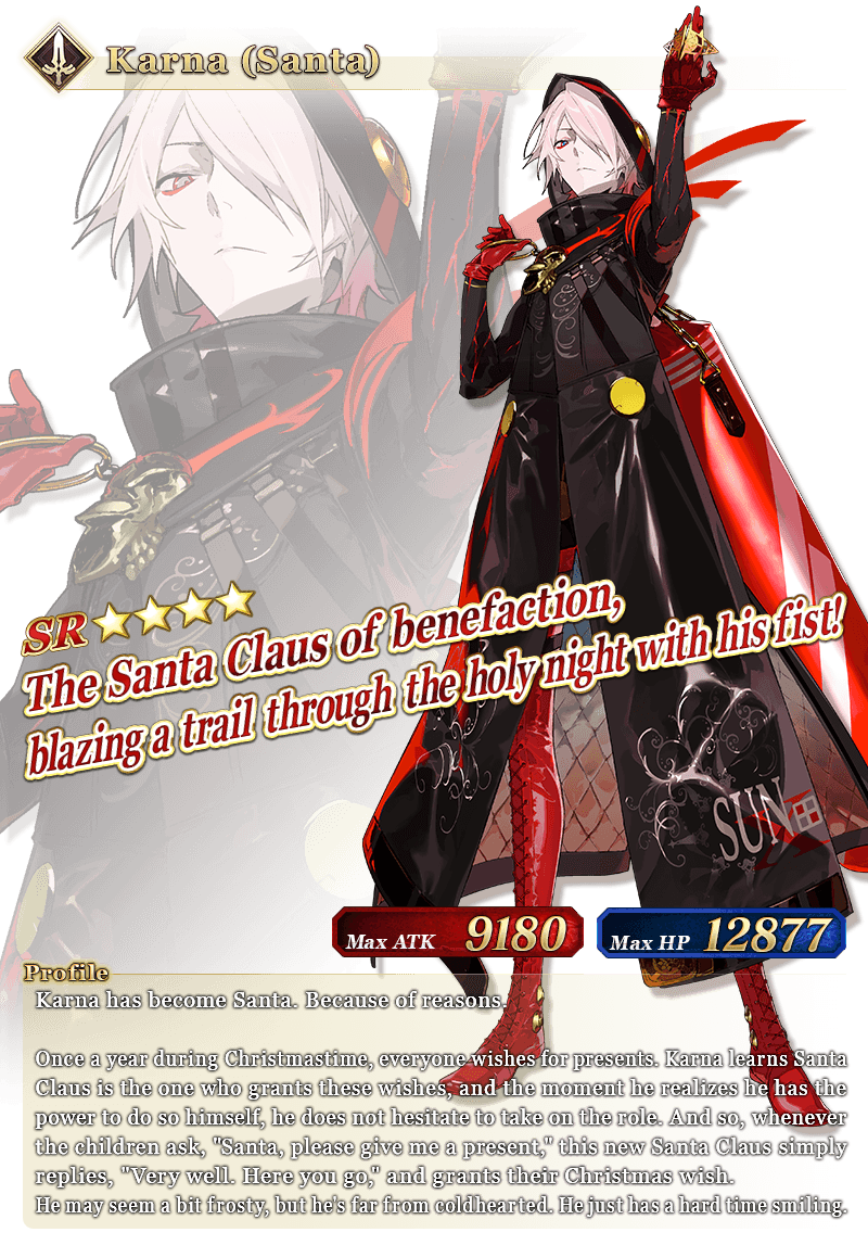 * The battle sprite for ★4 (SR) Karna (Santa) will not change with Ascension.
