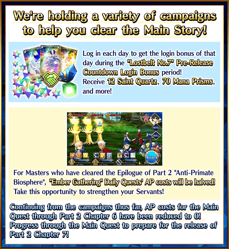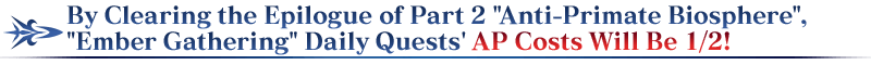 This campaign will have a special login bonus to count down to the release of Part 2 Chapter 7 and "Ember Gathering" Daily Quests' AP costs will be halved for Masters who fulfill the requirements!