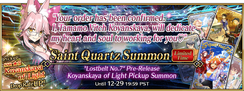 "'Lostbelt No.7' Pre-Release Koyanskaya of Light Pickup Summon" Details: