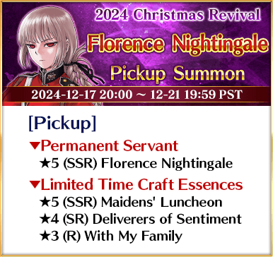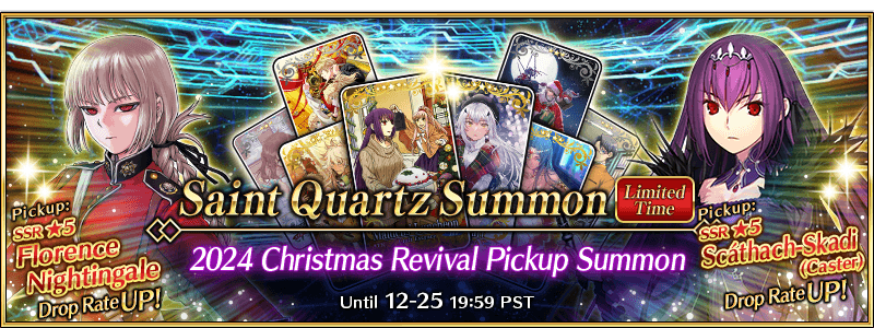 About Featured Servants: * The following Servant(s) will only be summonable from the Summon Lineup(s) where they are featured as Pickup Servant(s). Please be sure to confirm the lineup before summoning. - ★5 (SSR) Scáthach-Skadi (Caster) * The following Servant(s) will not be added to Story Summon after the Pickup Summon period ends. - ★5 (SSR) Scáthach-Skadi (Caster) * The following Servant(s) will continue to be available through Story Summon after the Pickup Summon period ends. - ★5 (SSR) Florence Nightingale * Servants added to Story Summon through story progression will not be summonable. Please be sure to confirm the lineup before summoning.