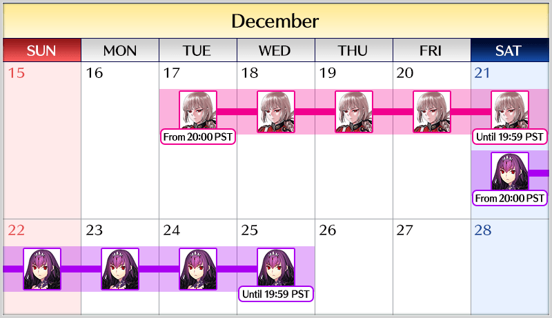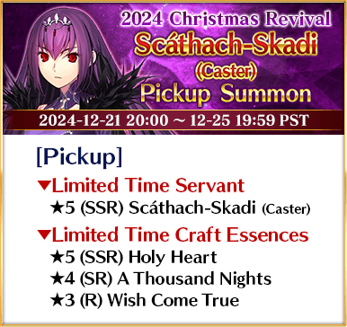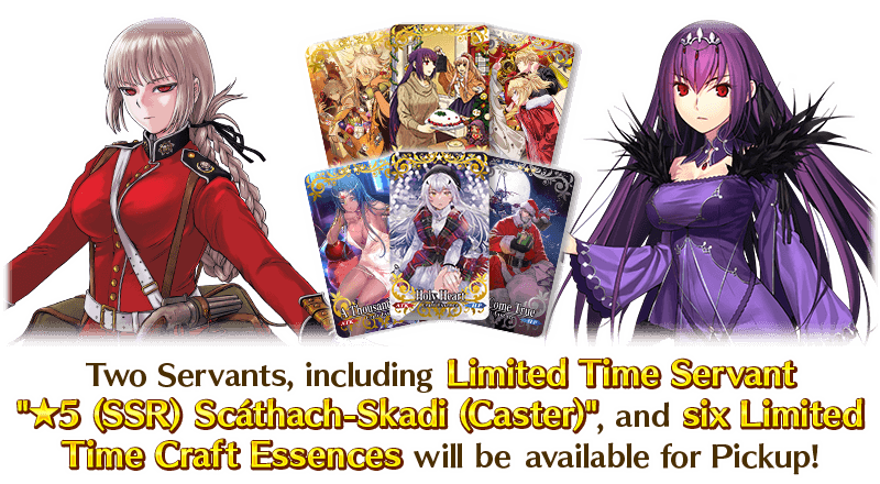 Two Servants, including Limited Time Servant "★5 (SSR) Scáthach-Skadi (Caster)", and six Limited Time Craft Essences will be available for Pickup in two Pickup Summons!