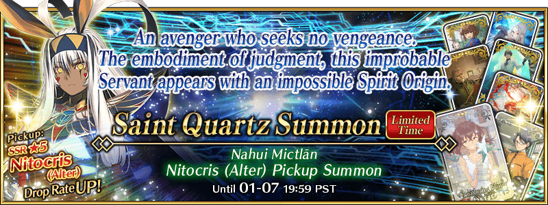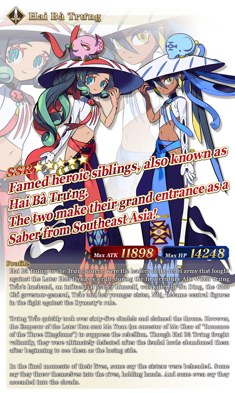 About Featured Servants: * The following Servant(s) will not be summonable from this Pickup Summon. - ★5 (SSR) Nitocris (Alter) * The following Servant(s) will only be summonable from the Summon Lineup(s) where they are featured as Pickup Servant(s). Please be sure to confirm the lineup before summoning. - ★5 (SSR) Hai Bà Trưng - ★5 (SSR) Kōnstantînos XI - ★5 (SSR) James Moriarty (Ruler) - ★5 (SSR) Sherlock Holmes - ★5 (SSR) Super Bunyan * The following Servant(s) will not be added to Story Summon after the Pickup Summon period ends. - ★5 (SSR) Hai Bà Trưng - ★5 (SSR) Kōnstantînos XI - ★5 (SSR) James Moriarty (Ruler) - ★5 (SSR) Sherlock Holmes - ★5 (SSR) Super Bunyan * Servants added to Story Summon through story progression will not be summonable. Please be sure to confirm the lineup before summoning.