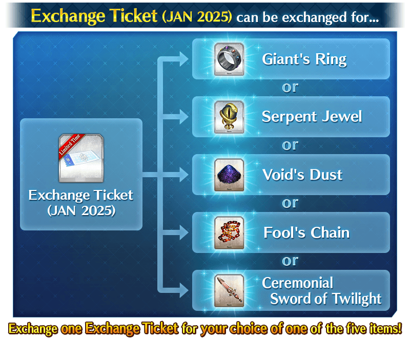 The "Exchange Ticket (JAN 2025)" available as a daily login bonus and daily mission rewards will be exchangeable for the following items.