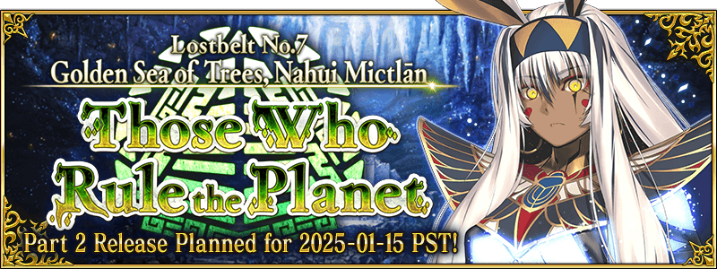 To go along with Part 2 Chapter 7 "Lostbelt No.7: Golden Sea of Trees, Nahui Mictlān - Those Who Rule the Planet" (Part 2), scheduled to be released in mid-January 2025, we're holding the "'Lostbelt No.7: Golden Sea of Trees, Nahui Mictlān - Those Who Rule the Planet' (Part 2) Pre-Release Campaign"!