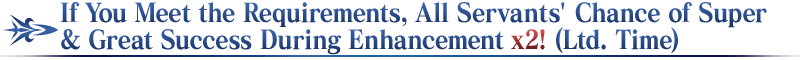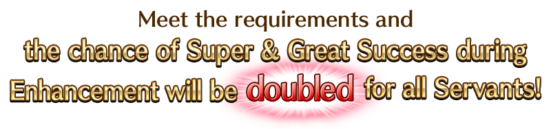 For Masters that meet the requirements, the chance of Super Success (double EXP acquired) and Great Success (triple EXP acquired) when performing Servant Enhancement will be doubled for all Servants for a limited time during the period below!