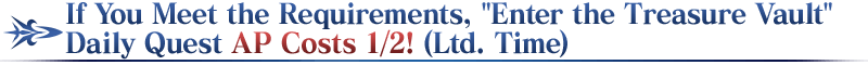 For Masters that meet the requirements, the daily "Enter the Treasure Vault" quests that appear within Chaldea Gate will have their AP costs halved for a limited time during the period below! (AP costs will be halved even if you withdraw from battle)