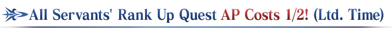 Rank Up Quests for all Servants will have their AP costs halved for a limited time during the period below! (AP costs will be halved even if you withdraw from battle)